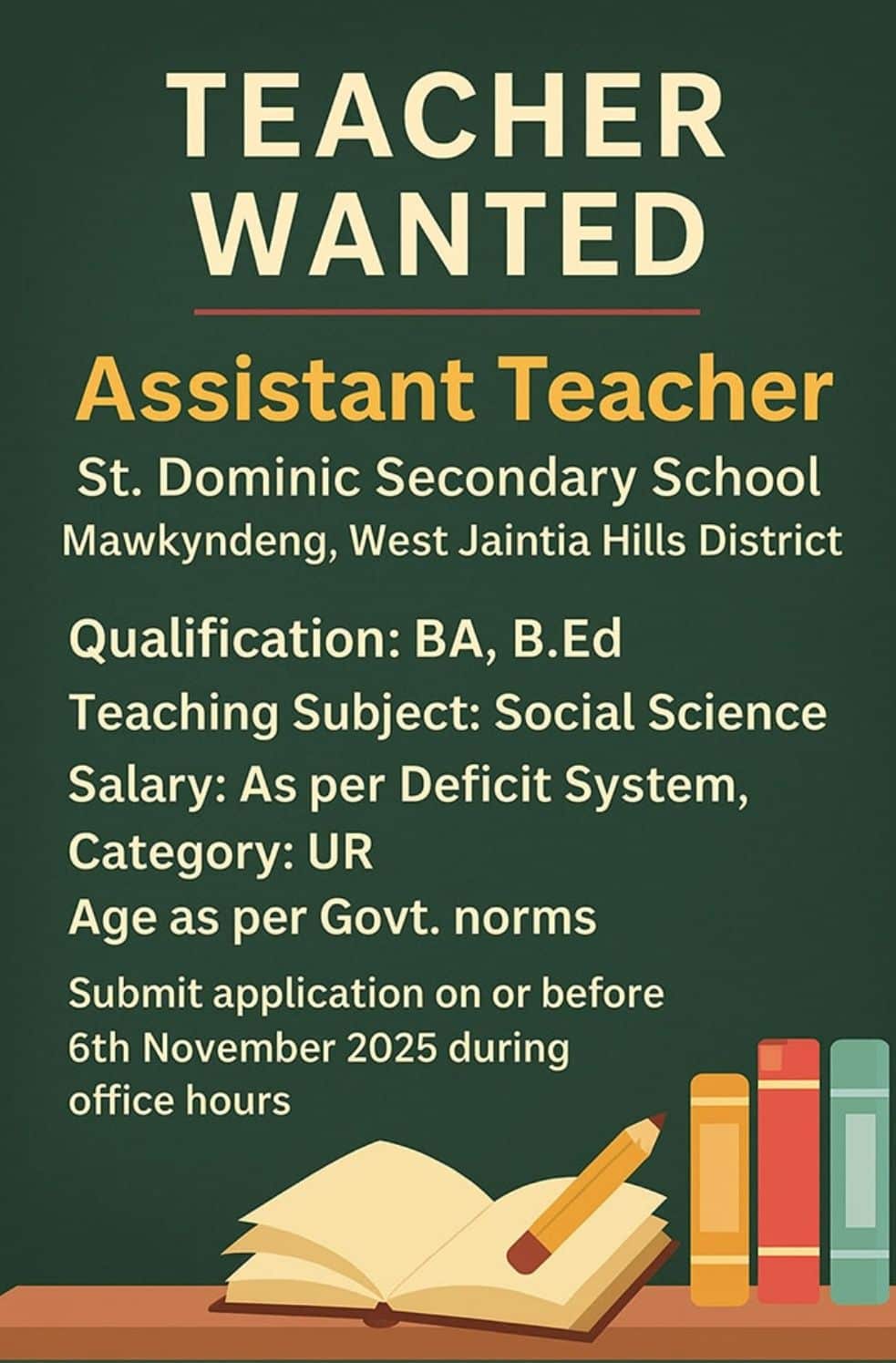 - Submit the application at St. Dominic Secondary School, Mawkynđeng, West Jaintia Hills District during office hours.